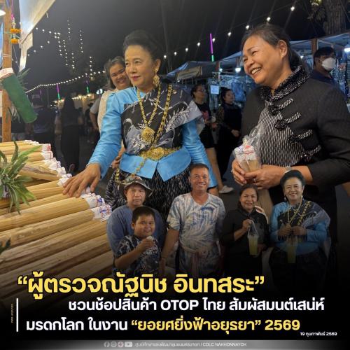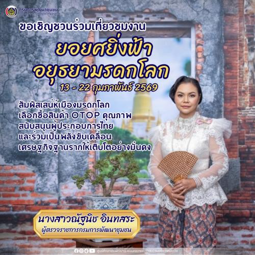 “…ขอเชิญชวนนักท่องเที่ยวและประชาชนร่วมเที่ยวชมงาน “ยอยศยิ่งฟ้า อยุธยามรดกโลก” 2569 สัมผัสเสน่ห์เมืองมรดกโลก ชมการแสดงอันตระการตา และเลือกซื้อสินค้า OTOP คุณภาพ เพื่อสนับสนุนผู้ประกอบการไทยและร่วมเป็นพลังขับเคลื่อนเศรษฐกิจฐานรากให้เติบโตอย่างมั่นคง…“ นางสาวณัฐนิช อินทสระ ผู้ตรวจราชการกรมการพัฒนาชุมชนกล่าว