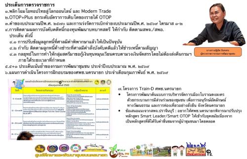 ในการนี้ นางสาวณัฐนิช อินทสระ ผู้ตรวจราชการกรมการพัฒนาชุมชน ได้ให้ข้อเสนอแนะและข้อสั่งการเพื่อขับเคลื่อนการดำเนินงานพัฒนาชุมชนให้บรรลุผลสัมฤทธิ์ และเกิดประโยชน์ต่อประชาชนอย่างเป็นรูปธรรม โดยเน้นย้ำการส่งเสริมและสนับสนุนผู้ผลิต ผู้ประกอบการ OTOP ในการพัฒนาผลิตภัณฑ์ให้มีคุณภาพ ได้มาตรฐาน และสอดคล้องกับความต้องการของตลาด พร้อมผลักดันการจำหน่ายผ่านช่องทาง Modern Trade และ E-commerce โดยบูรณาการความร่วมมือกับภาคเอกชน เพื่อเพิ่มโอกาสทางการตลาด ทั้งนี้ ให้คำนึงถึงศักยภาพและความพร้อมของผู้ผลิตและผู้ประกอบการ OTOP เป็นสำคัญ