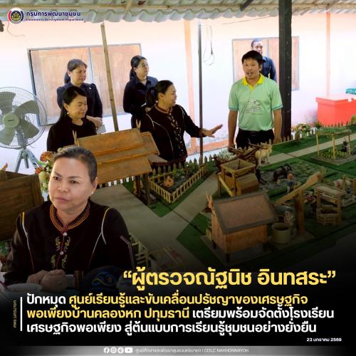 นางสาวณัฐนิช อินทสระ ผู้ตรวจราชการกรม ปฏิบัติหน้าที่ผู้อำนวยการศูนย์ศึกษาและพัฒนาชุมชนนครนายก ลงพื้นที่ติดตามการดำเนินงานตามนโยบายสำคัญของรัฐบาล กระทรวงมหาดไทย และภารกิจของกรมการพัฒนาชุมชน ในพื้นที่อำเภอคลองหลวง จังหวัดปทุมธานี โดยมุ่งเน้นการเตรียมความพร้อมจัดตั้งโรงเรียนเศรษฐกิจพอเพียง ประจำปีงบประมาณ พ.ศ. 2569 ทั้งนี้ นายธตปัณณ มาพวง ผู้อำนวยการกลุ่มงานตรวจราชการ พร้อมด้วยบุคลากรกลุ่มงานตรวจราชการ ร่วมลงพื้นที่ด้วย
